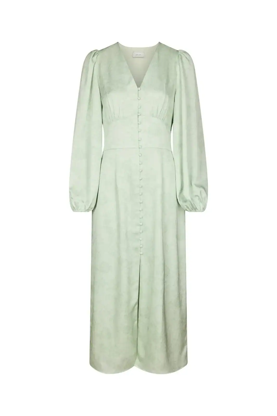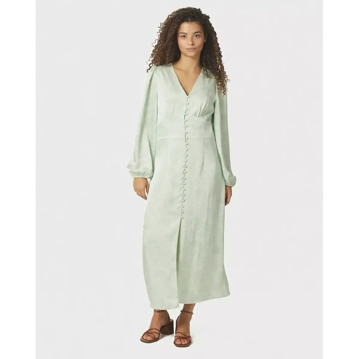 Ljusgrön klänning i en fin polyesterkvalitet. Klänningen har v-ringning, långa lösa ärmar och knappar längs framsidan. Läs mer
