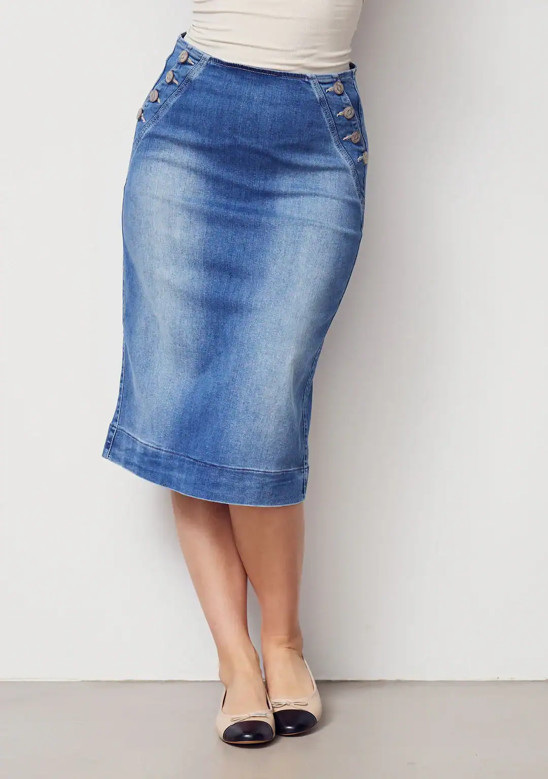 Como Highwaist Skirt i midi-längd är den perfekta vardagskjolen som kombinerar funktionalitet och stil till perfektion. Denna jeanskjol har hög midja och en praktisk slits baktill som gör den lätt att röra sig i. Det unika med kjolen är de tre stora knapparna som ger en fräsch touch till den klassiska designen. Tillverkad i en hållbar bomullsblandning med stretch, garanterar den komfort hela dagen. Como Highwaist Skirt är lätt att styla med det mesta i din garderob, från en snygg skjorta till en avslappnad stickad tröja, och passar perfekt för både jobb och fritid.
