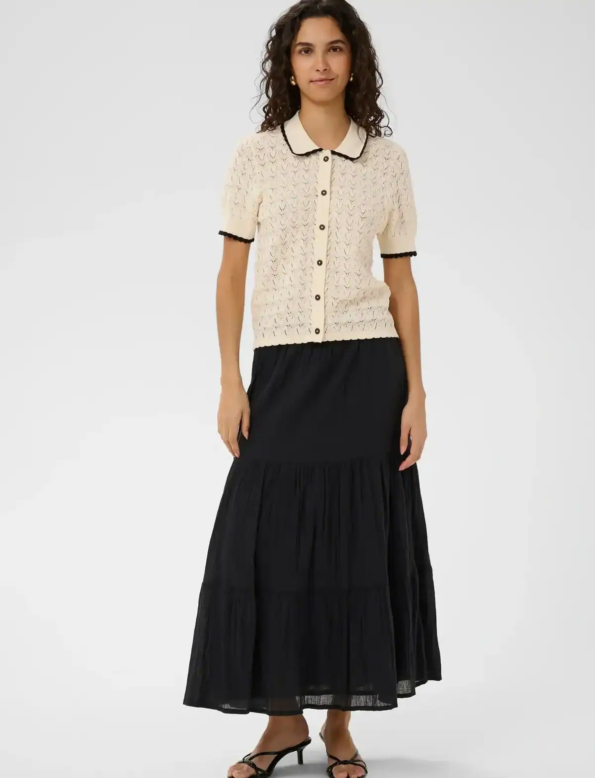 Denna maxikjol har en design med flera nivåer som ger en böljande silhuett. Den elastiska midjan ger en bekväm passform, vilket gör den idealisk för användning hela dagen. Läs mer