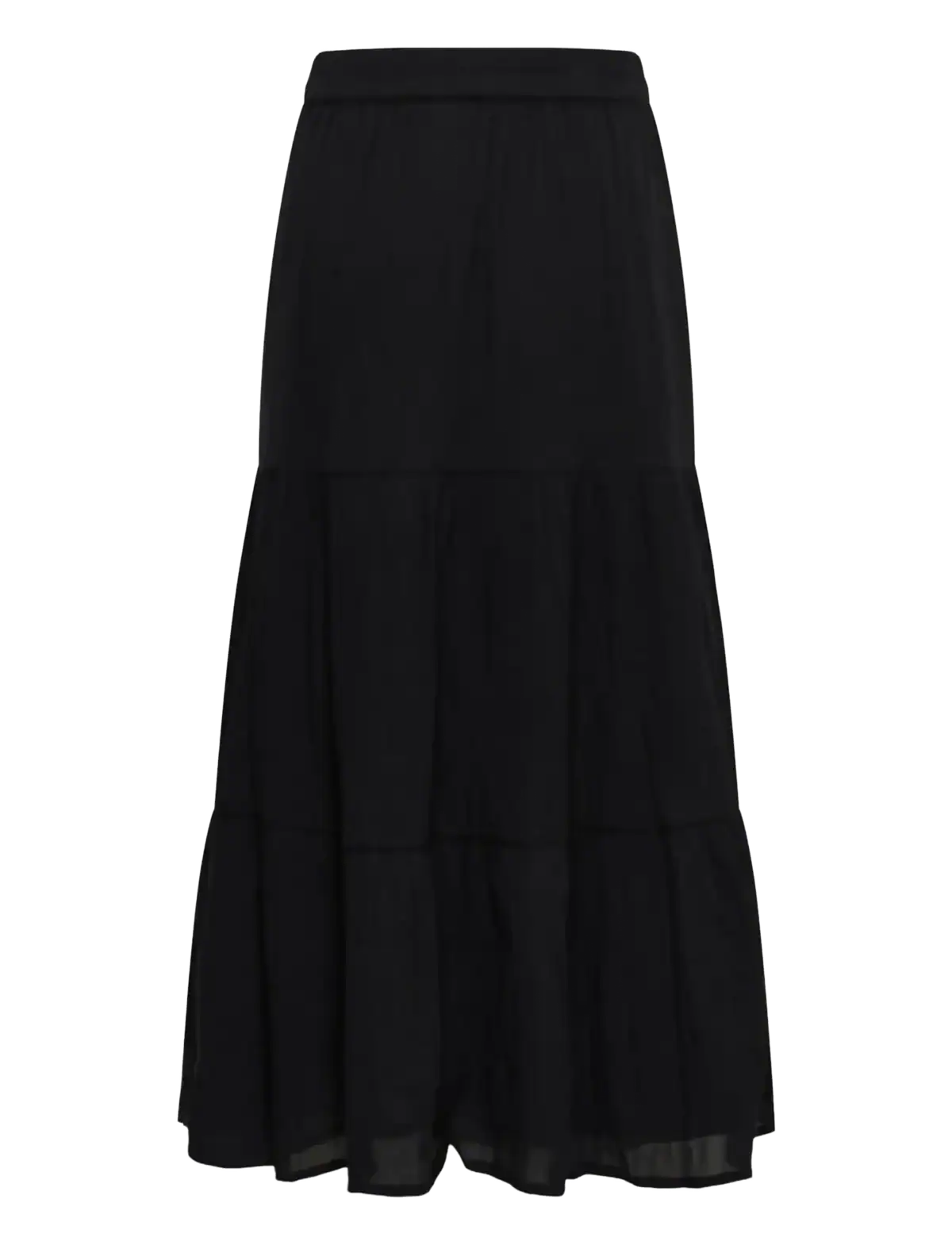 Denna maxikjol har en design med flera nivåer som ger en böljande silhuett. Den elastiska midjan ger en bekväm passform, vilket gör den idealisk för användning hela dagen.
