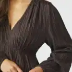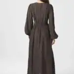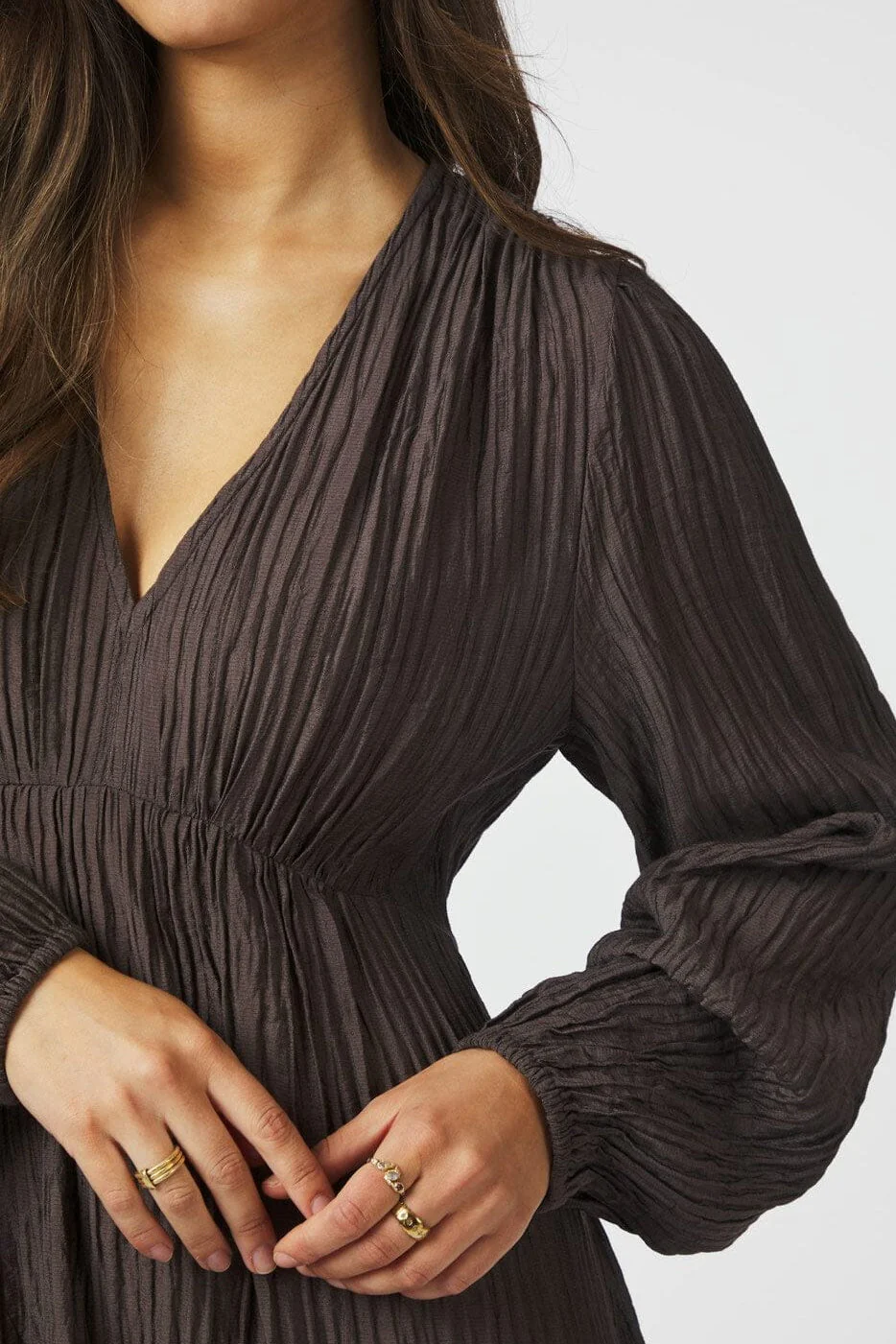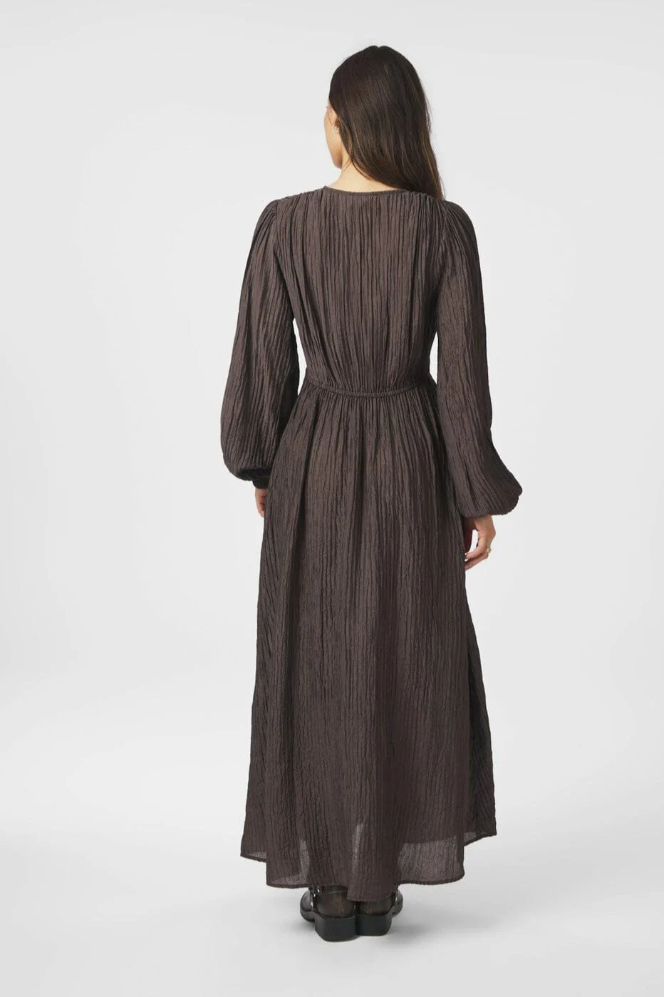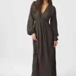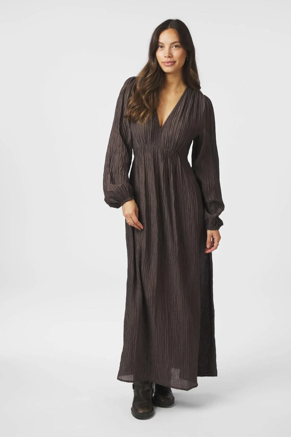 SIlfi Crepe Dress är en stilren och feminin klänning i ett elegant, krinklat crepematerial. Med sin djupa V-ringning, långa ärmar och markerade midja framhäver den figuren på ett smickrande sätt. Den mörkbruna nyansen gör den lätt att styla både till vardag och fest.